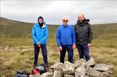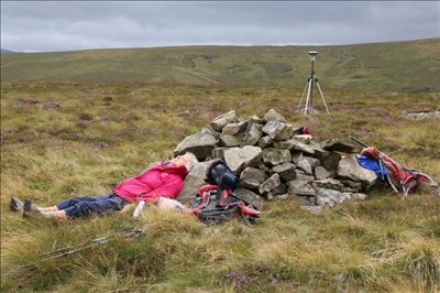 The three surveyors were already hard at work with the ascent from two cols to check and, of course, the absolute height of the summit. By now the sun had disappeared and the wind again felt chill. Anne relaxed with her head on the cairn while the surveyors with graduated staff and sophisticated level measured the ascent from both cols. They converged on us and conveyed the news that Miller Moss had the required ascent from both cols, but we would have to wait for a few days to learn the height of the summit. Could the Ordnance Survey have got it wrong?